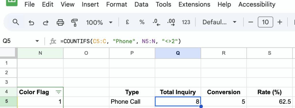 =COUNTIFS(C5:C, “Phone”, N5:N, “<>2”)