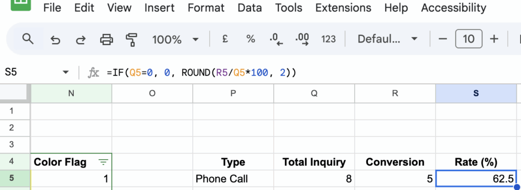 =IF(Q5=0, 0, ROUND(R5/Q5*100, 2))
